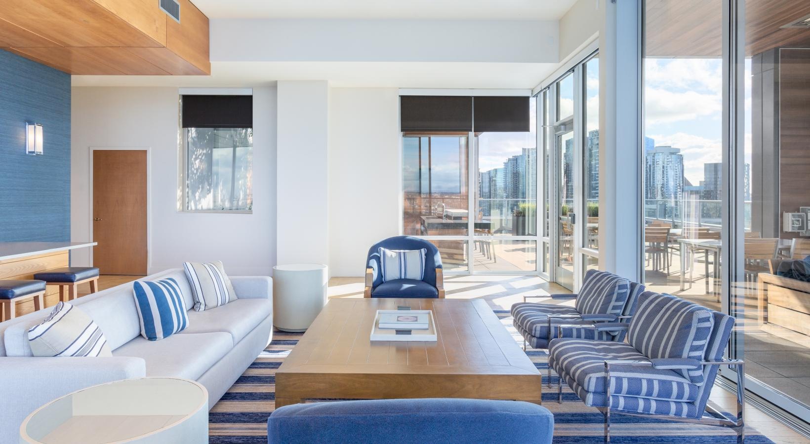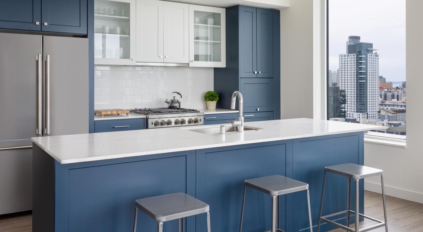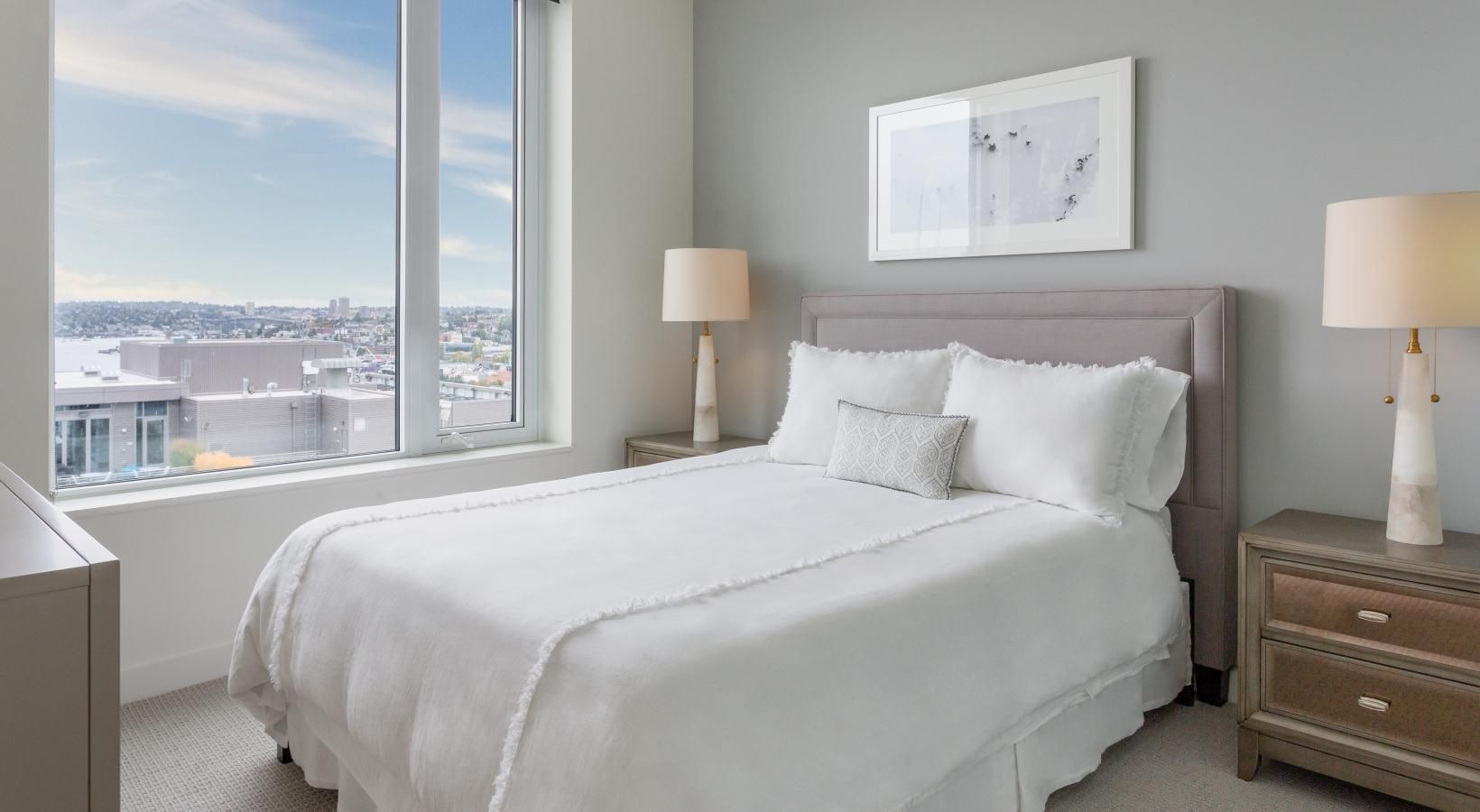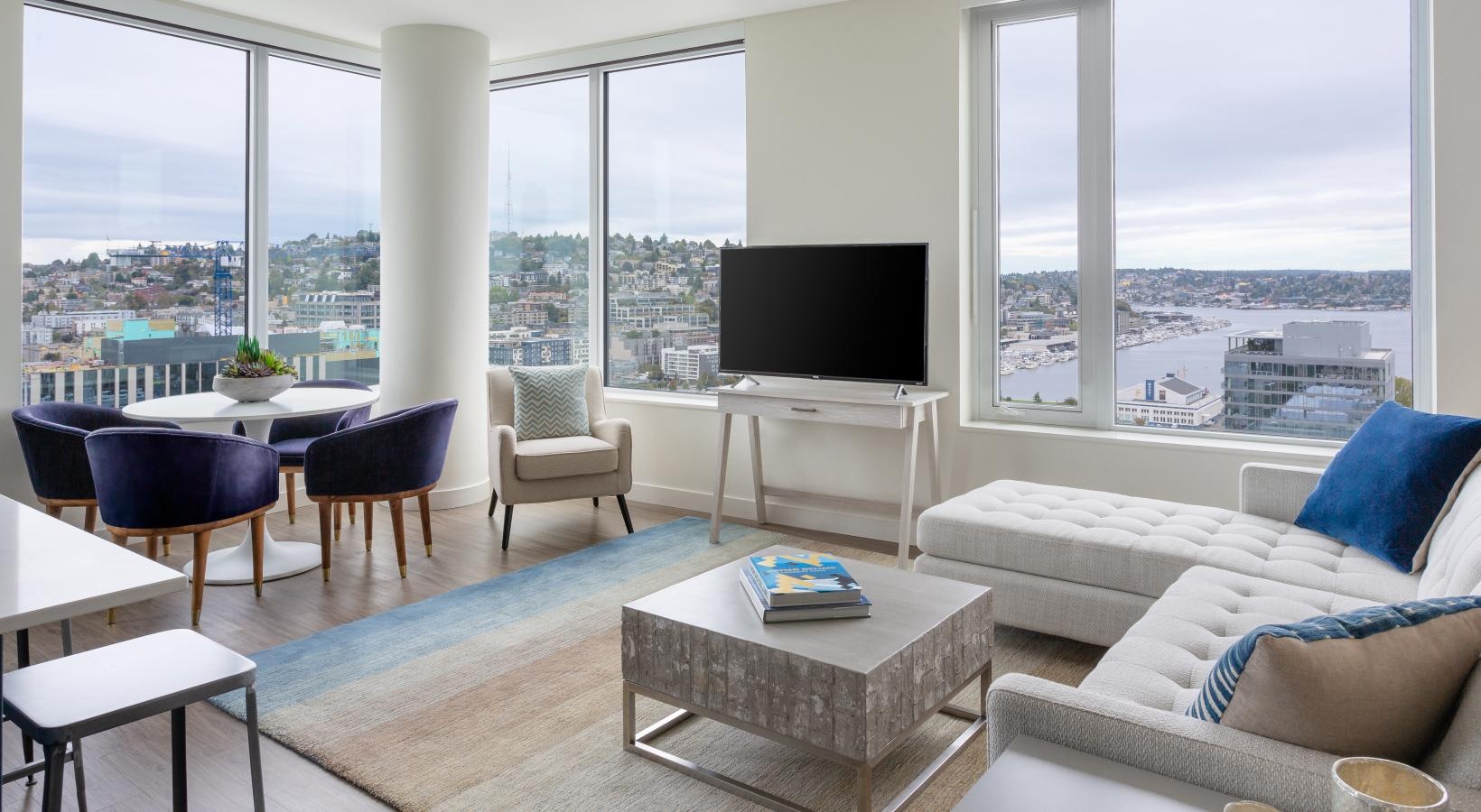The big picture is this: clean, modern lines, expansive views and light, and finishes that evoke elegance and promise ease and comfort. The fine print is similarly noteworthy — five-burner gas ranges, Blomberg stainless steel appliances, tile backsplashes, marble-inspired countertops, plank hardwood flooring, Nest thermostats with central air, and Brizio fixtures in kitchens and baths. Our spacious Seattle apartments provide every little luxury you need to unwind and stretch out, with built-in closet storage, available walk-in closets, and airy living areas with oversized windows featuring views of SLU, the Space Needle, and the Downtown skyline.