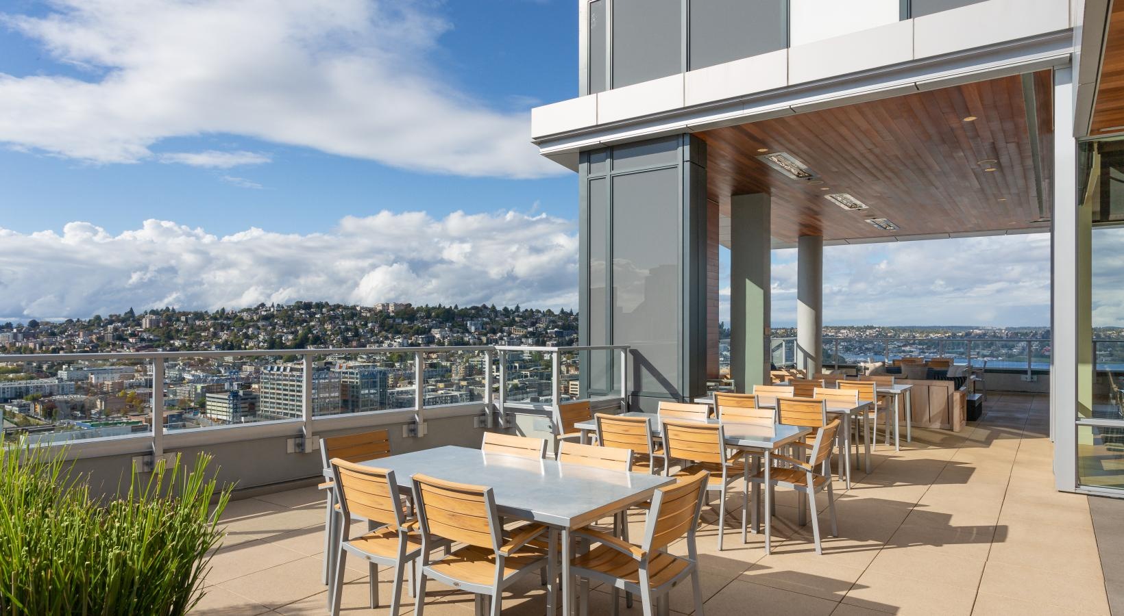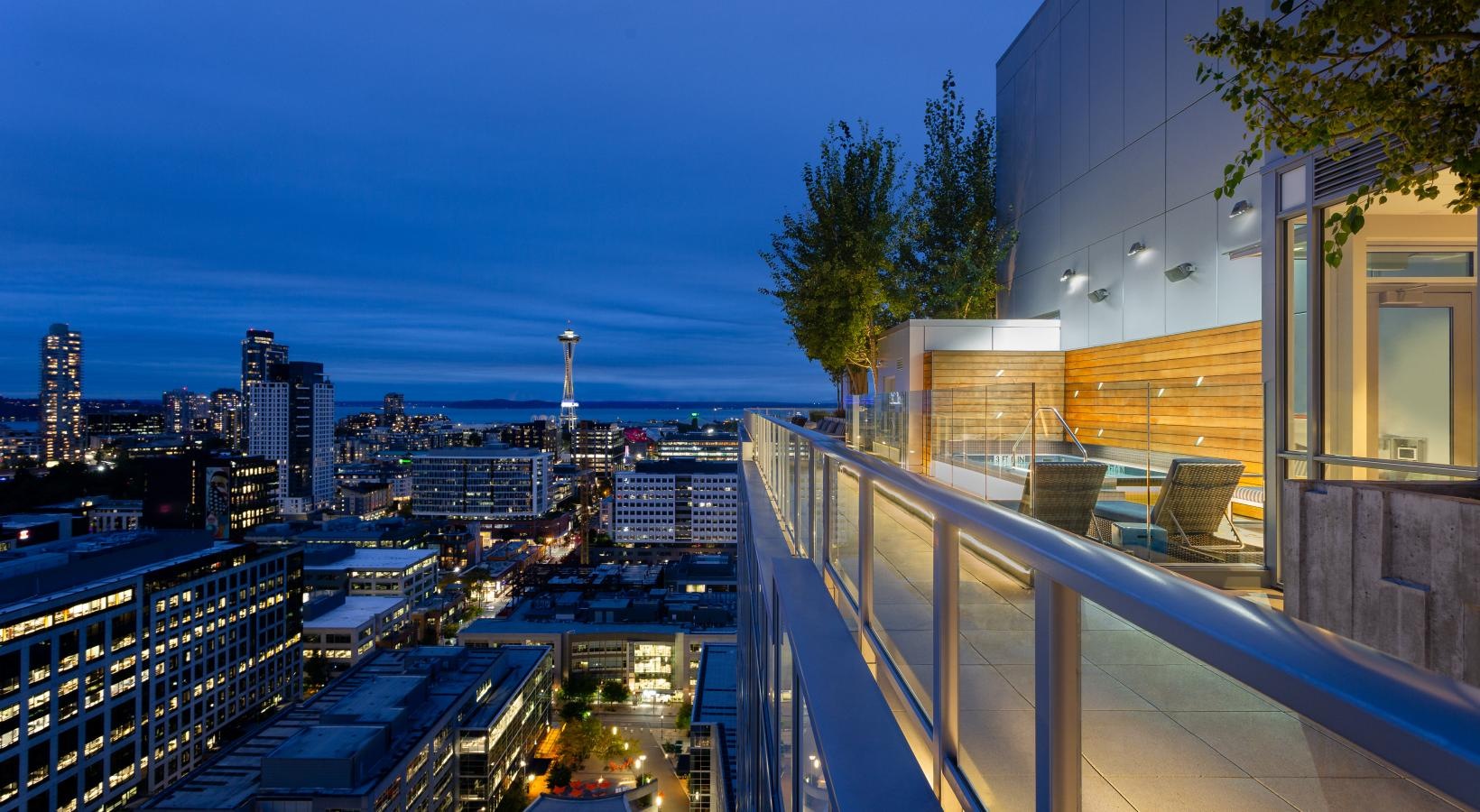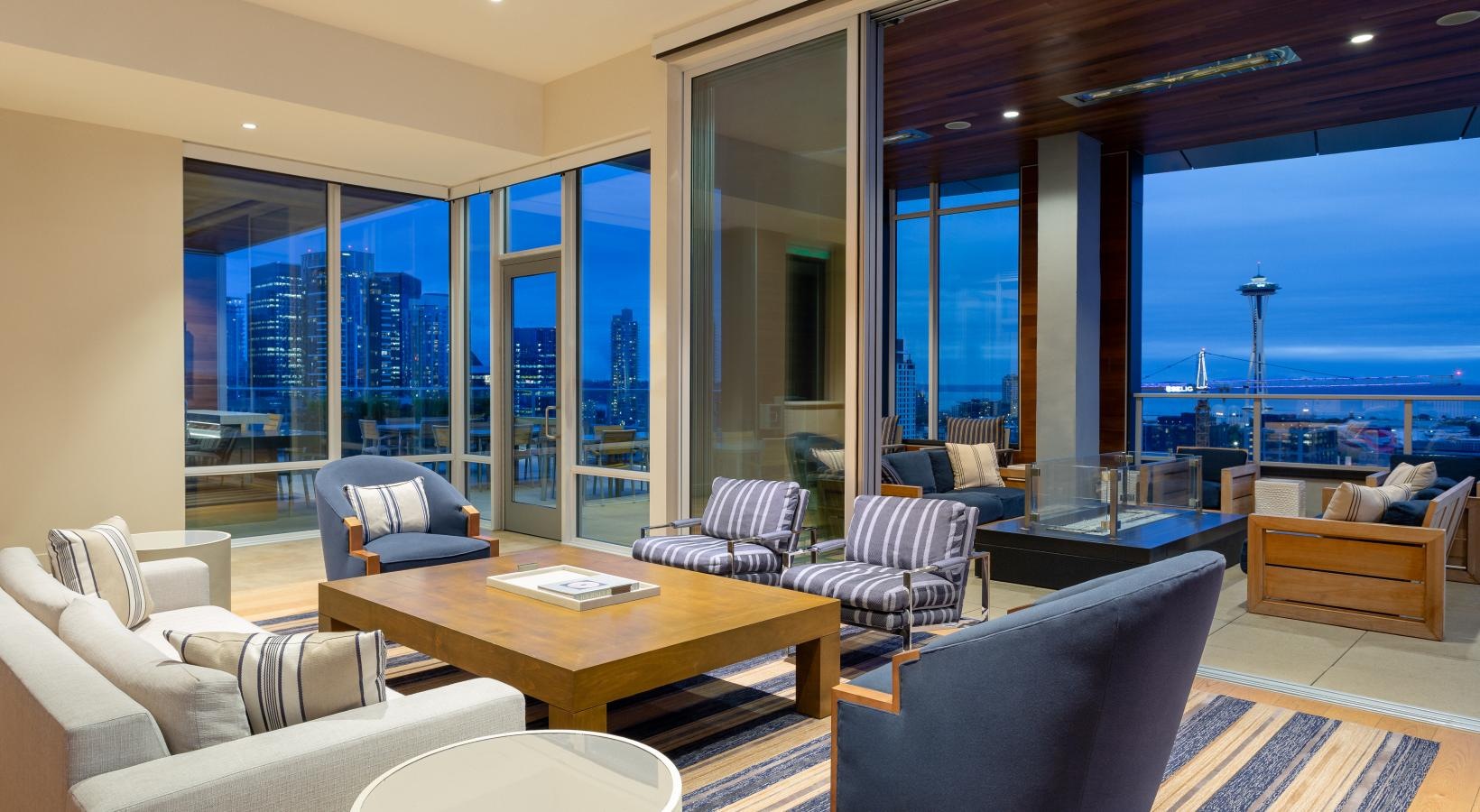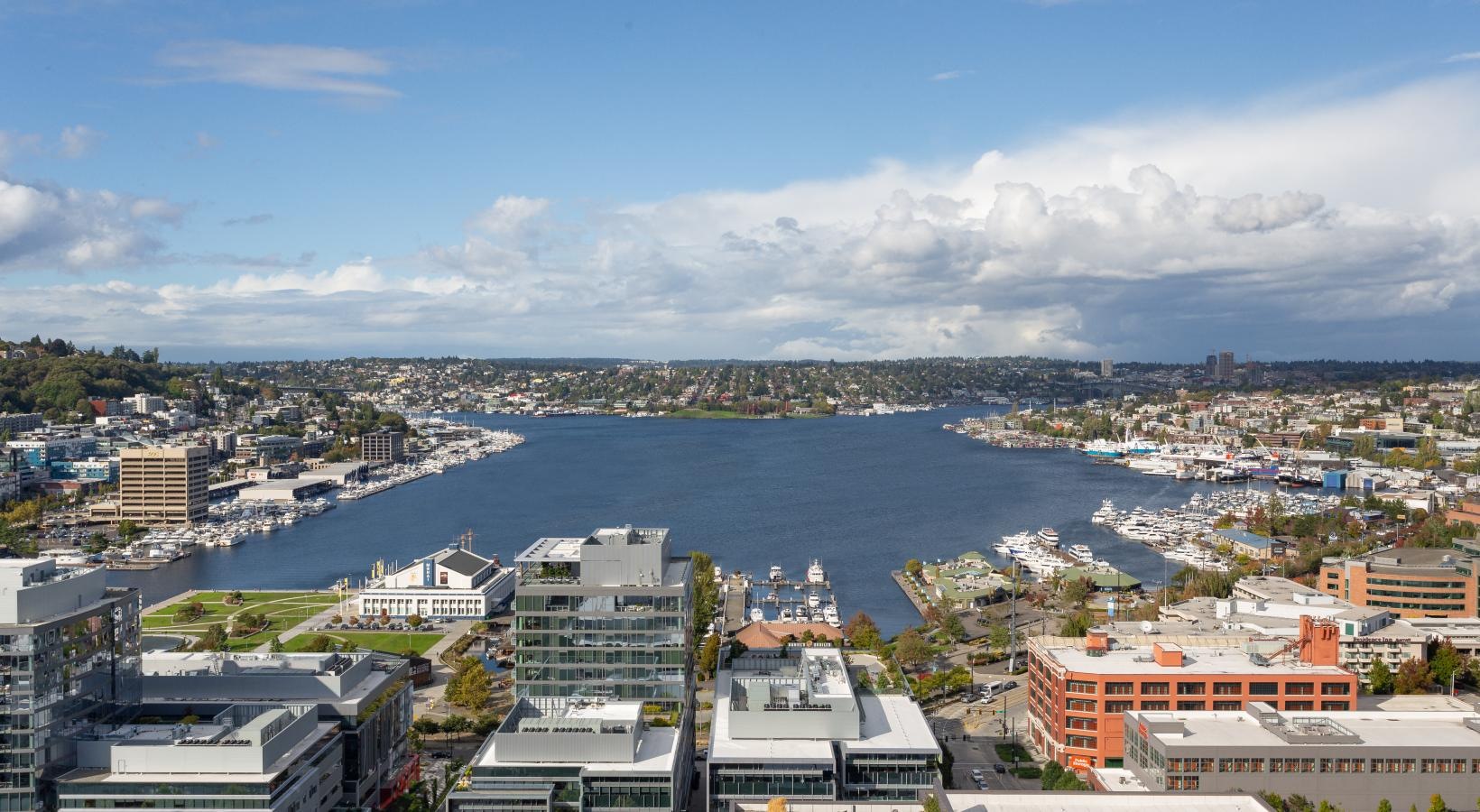 The big picture is this: clean, modern lines, expansive views and light, and finishes that evoke elegance and promise ease and comfort. The fine print is similarly noteworthy — five-burner gas ranges, Blomberg stainless steel appliances, tile backsplashes, marble-inspired countertops, plank hardwood flooring, Nest thermostats with central air, and Brizio fixtures in kitchens and baths. Our spacious Seattle apartments provide every little luxury you need to unwind and stretch out, with built-in closet storage, available walk-in closets, and airy living areas with oversized windows featuring views of SLU, the Space Needle, and the Downtown skyline.