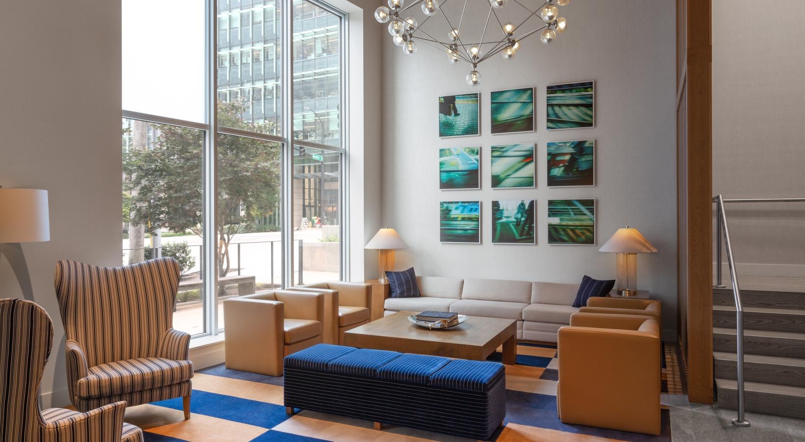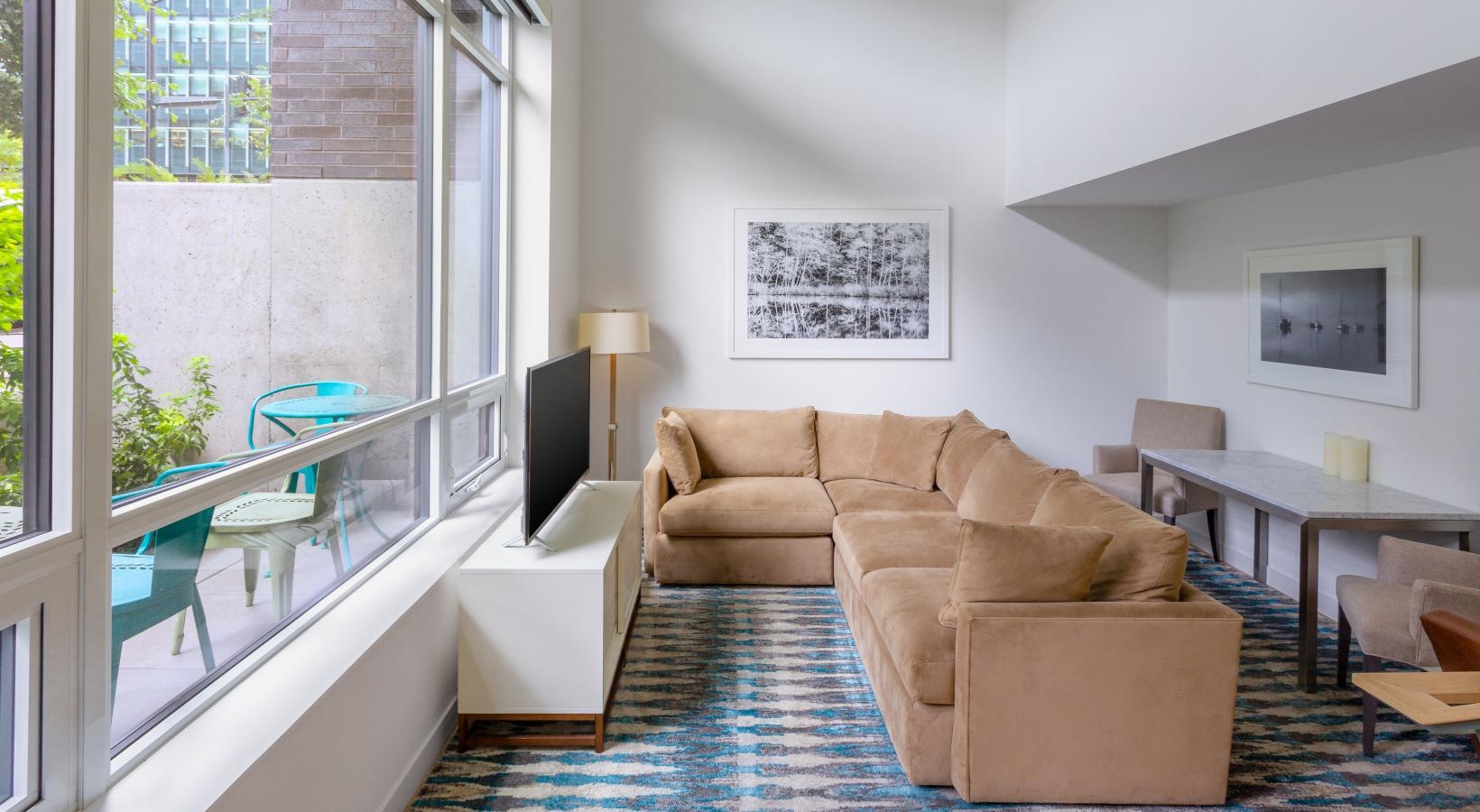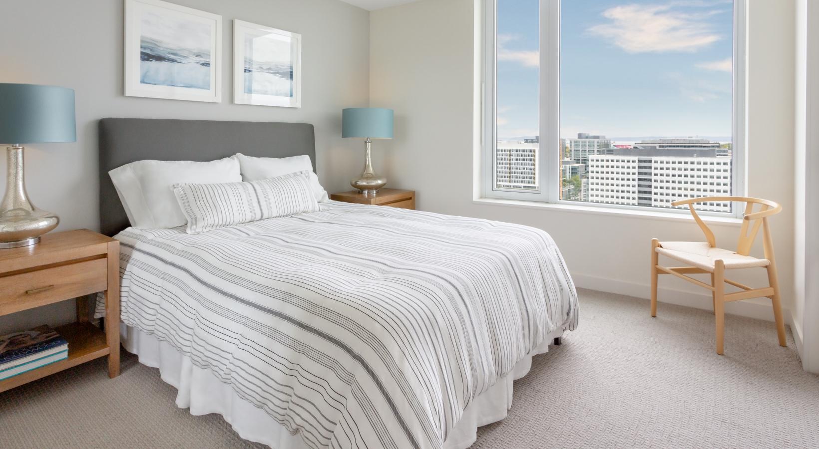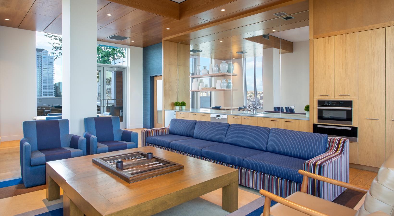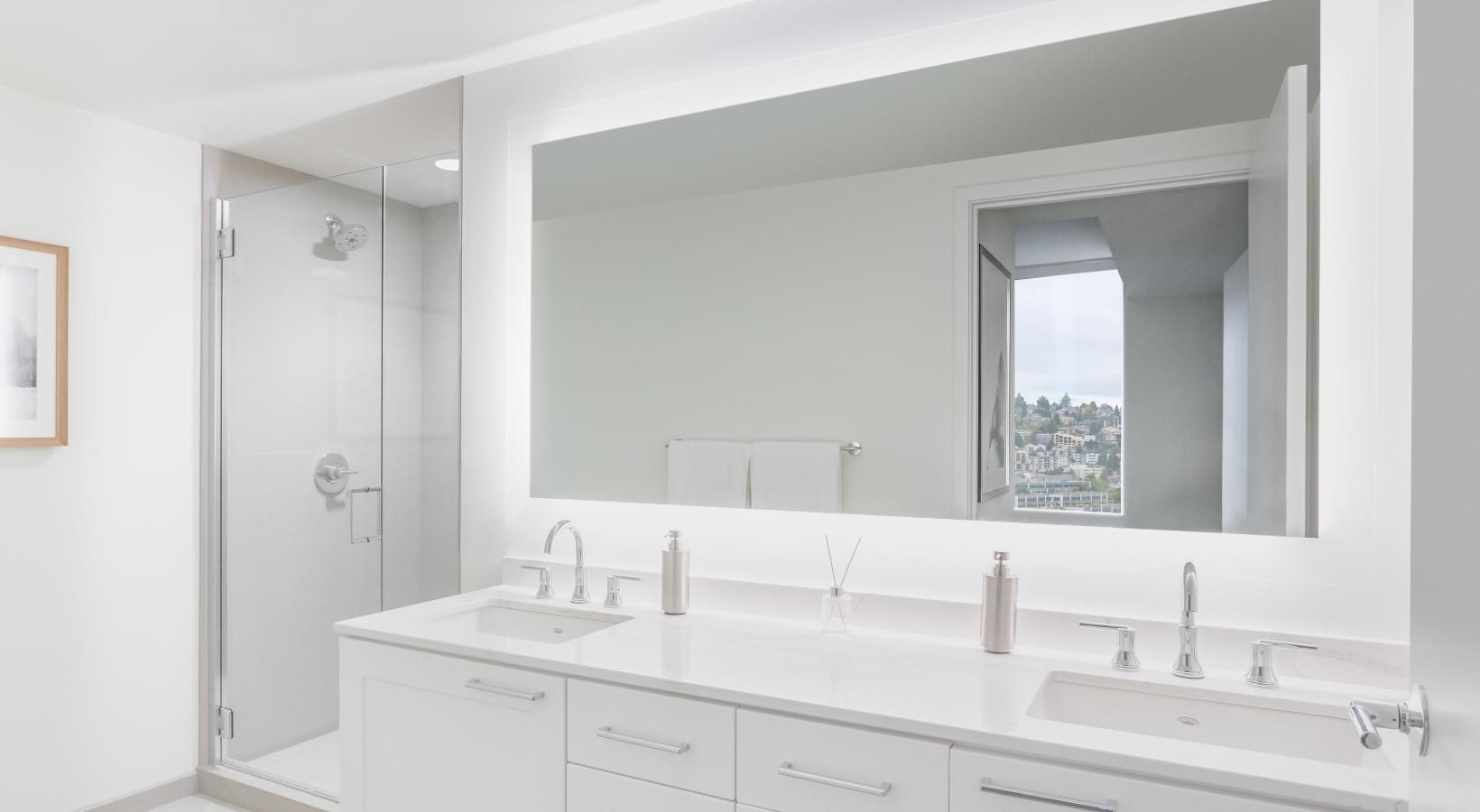 The big picture is this: clean, modern lines, expansive views and light, and finishes that evoke elegance and promise ease and comfort. The fine print is similarly noteworthy — five-burner gas ranges, Blomberg stainless steel appliances, tile backsplashes, marble-inspired countertops, plank hardwood flooring, Nest thermostats with central air, and Brizio fixtures in kitchens and baths. Our spacious Seattle apartments provide every little luxury you need to unwind and stretch out, with built-in closet storage, available walk-in closets, and airy living areas with oversized windows featuring views of SLU, the Space Needle, and the Downtown skyline.